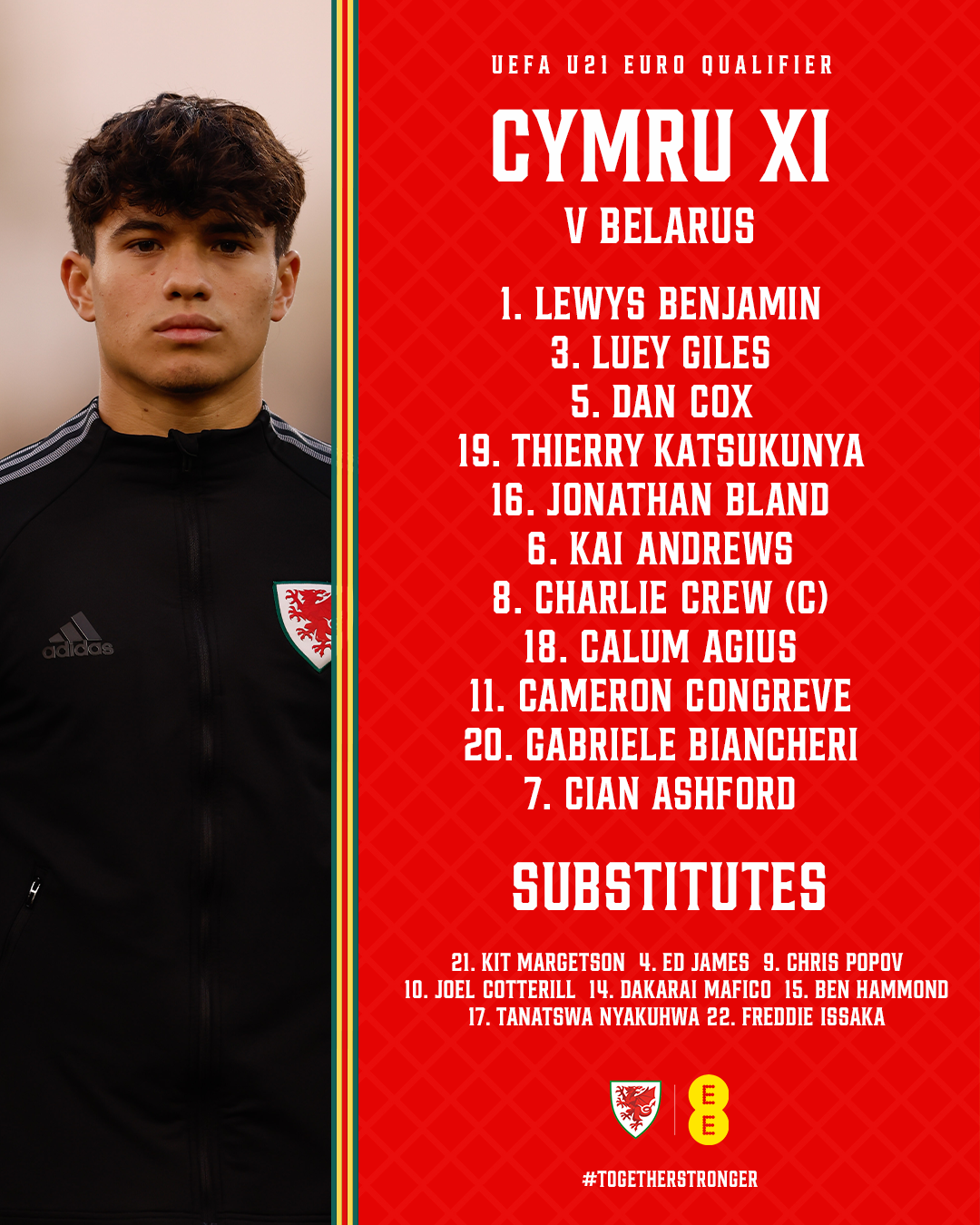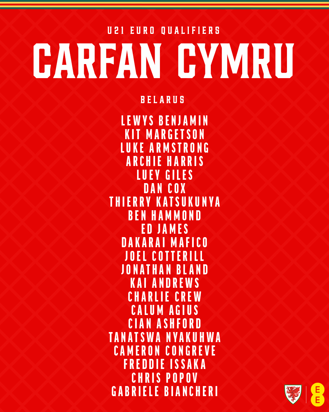 Cymru claimed an impressive 2-0 victory away to Austria in Linz last month to earn their first points of the qualifying campaign through goals from Gabriele Biancheri and Chris Popov. Both players are included for this latest Group I match together with Charlie Crew and Kai Andrews, who were recently involved with Craig Bellamy’s senior squad.