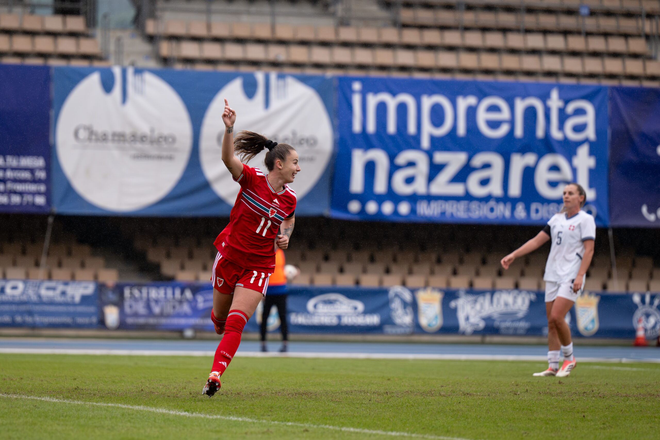 The most-recent fixture remains the most memorable as the two nations met in Zurich in October 2022 for the FIFA Women’s World Cup play-off final. Rhiannon Roberts gave Cymru the lead after 19 minutes (below) before Ramona Bachamann levelled for the home side to take the game to extra-time.
