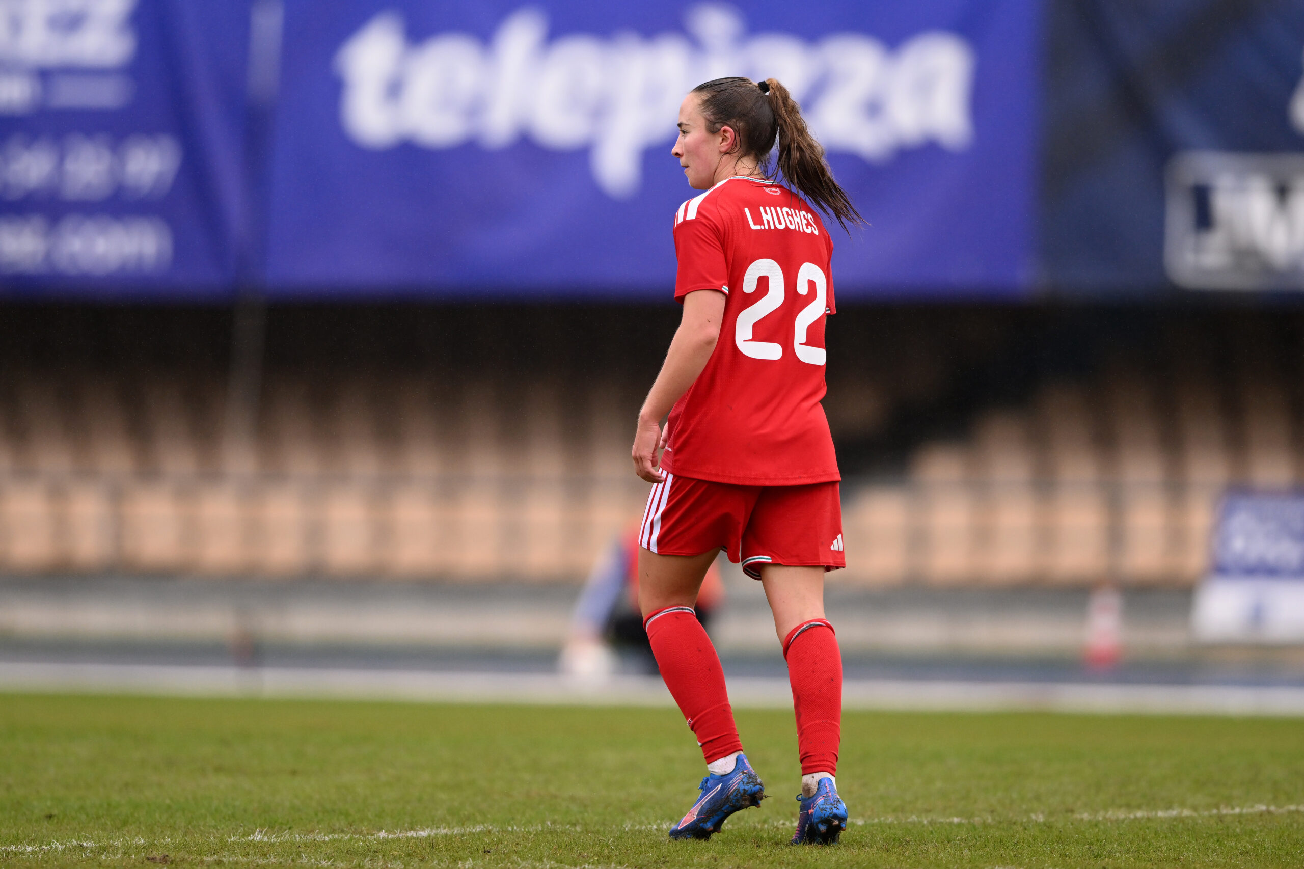 Mared Griffiths makes a darting run down the right for Cymru and curls a narrow strike just over the bar as she looks to net her side’s fourth goal of the afternoon.