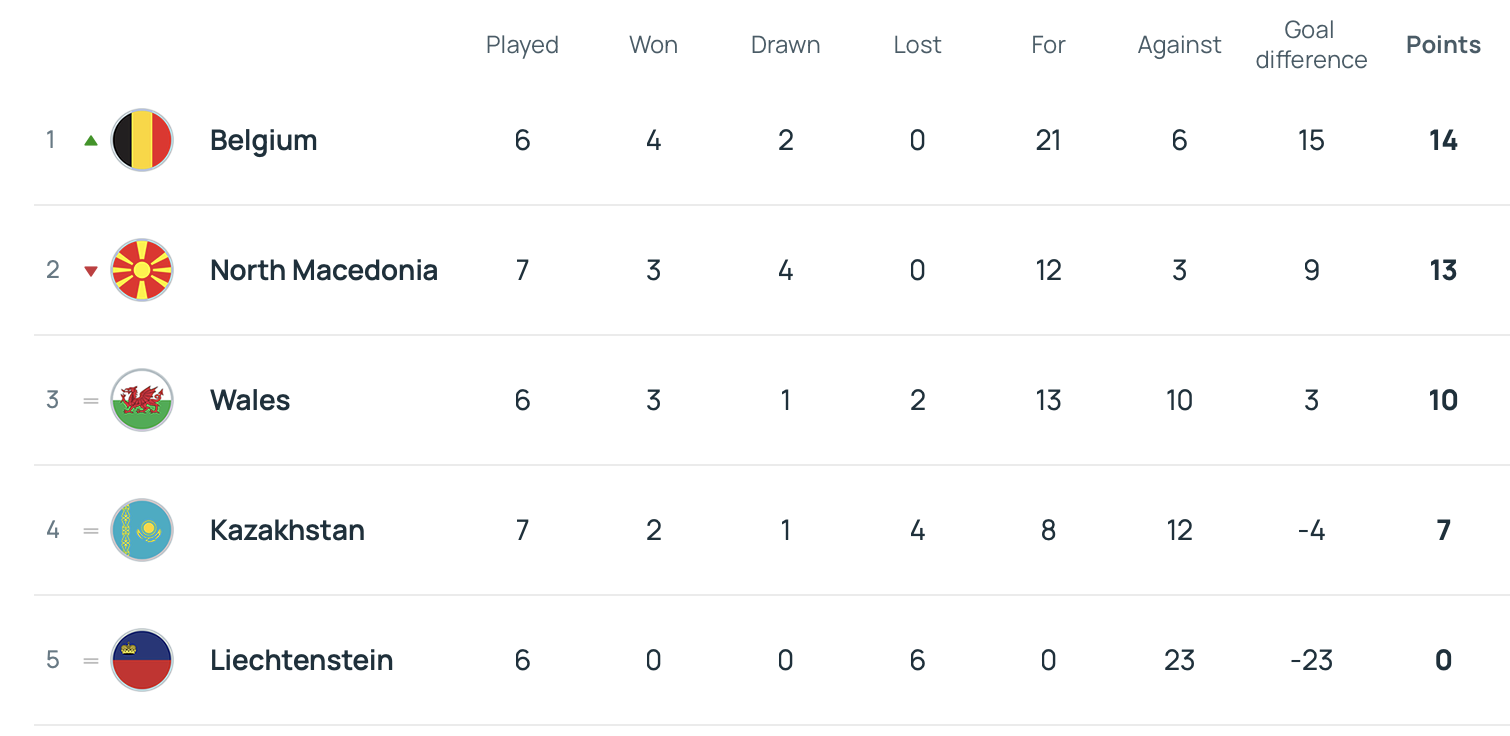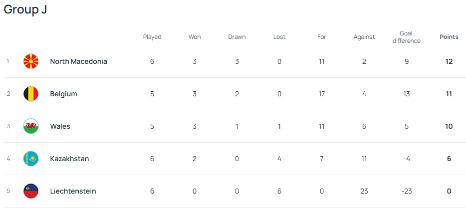 North Macedonia still top the group with 12 points while Belgium and Cymru are on 11 and 10 points respectively, and both teams have played one game less than the current leaders.