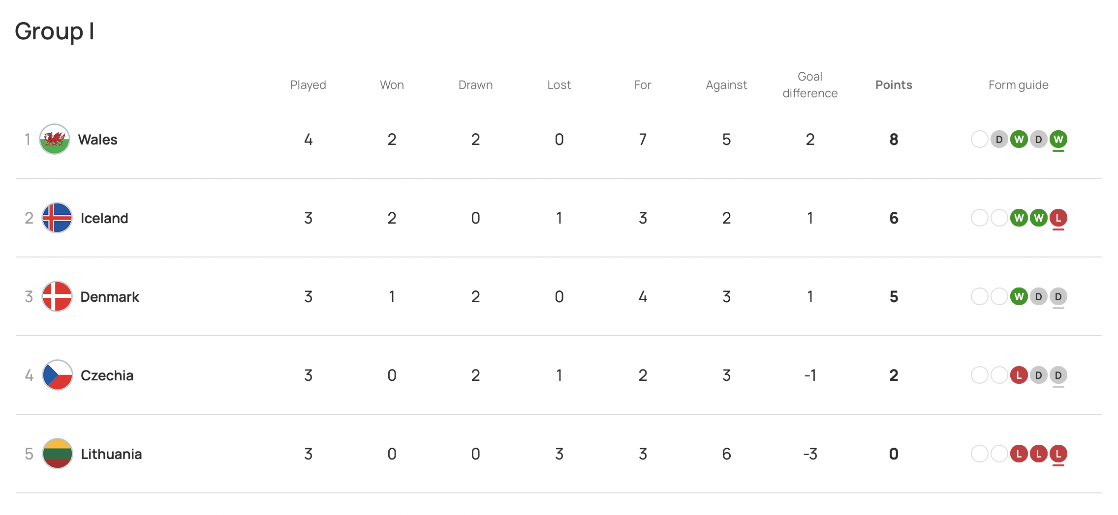 Here’s a look at the state of play in Group I ahead of Monday’s fixture. Cymru’s victory on Thursday saw them move two points clear at the top of the group, albeit they have played a game more than Iceland. Denmark played out a goalless draw with 10-man Czechia in their last qualifier in September.