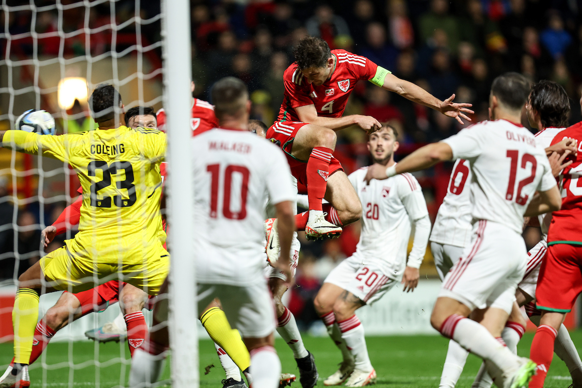 Ben Davies heads Cymru into the lead from a corner kick.