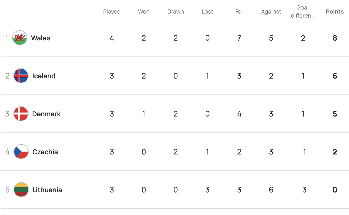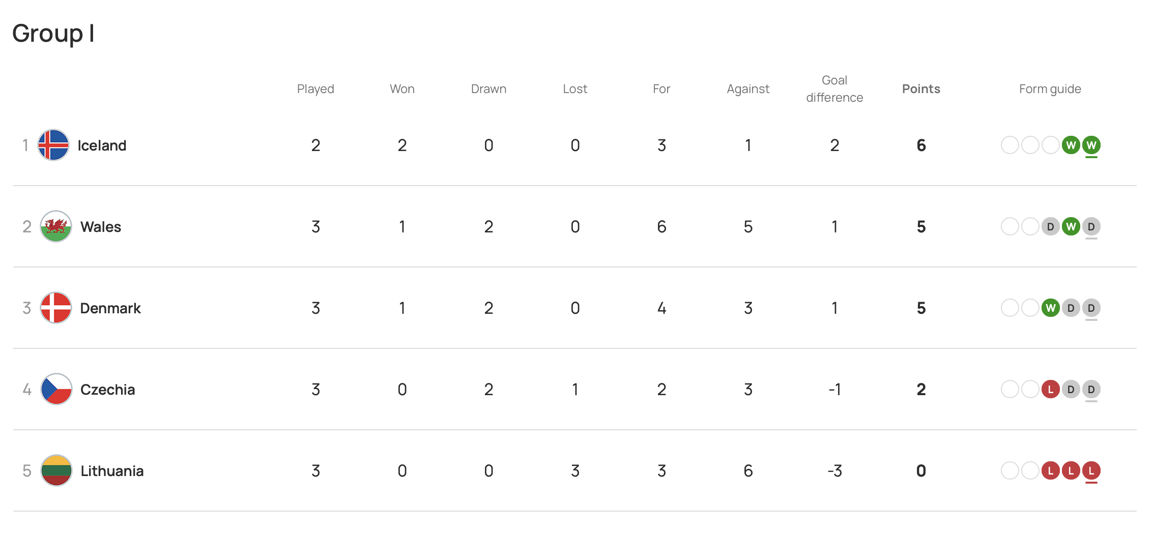 Here’s a look at the state of play in Group I ahead of this evening’s fixture. Iceland lead the way in the group after beating Czechia 2-1 in their opening qualifier before a 1-0 win over Lithuania last month. Cymru began their qualifying campaign with a 2-2 draw with Denmark, before a 3-2 victory over Lithuania and 1-1 draw with Czechia.