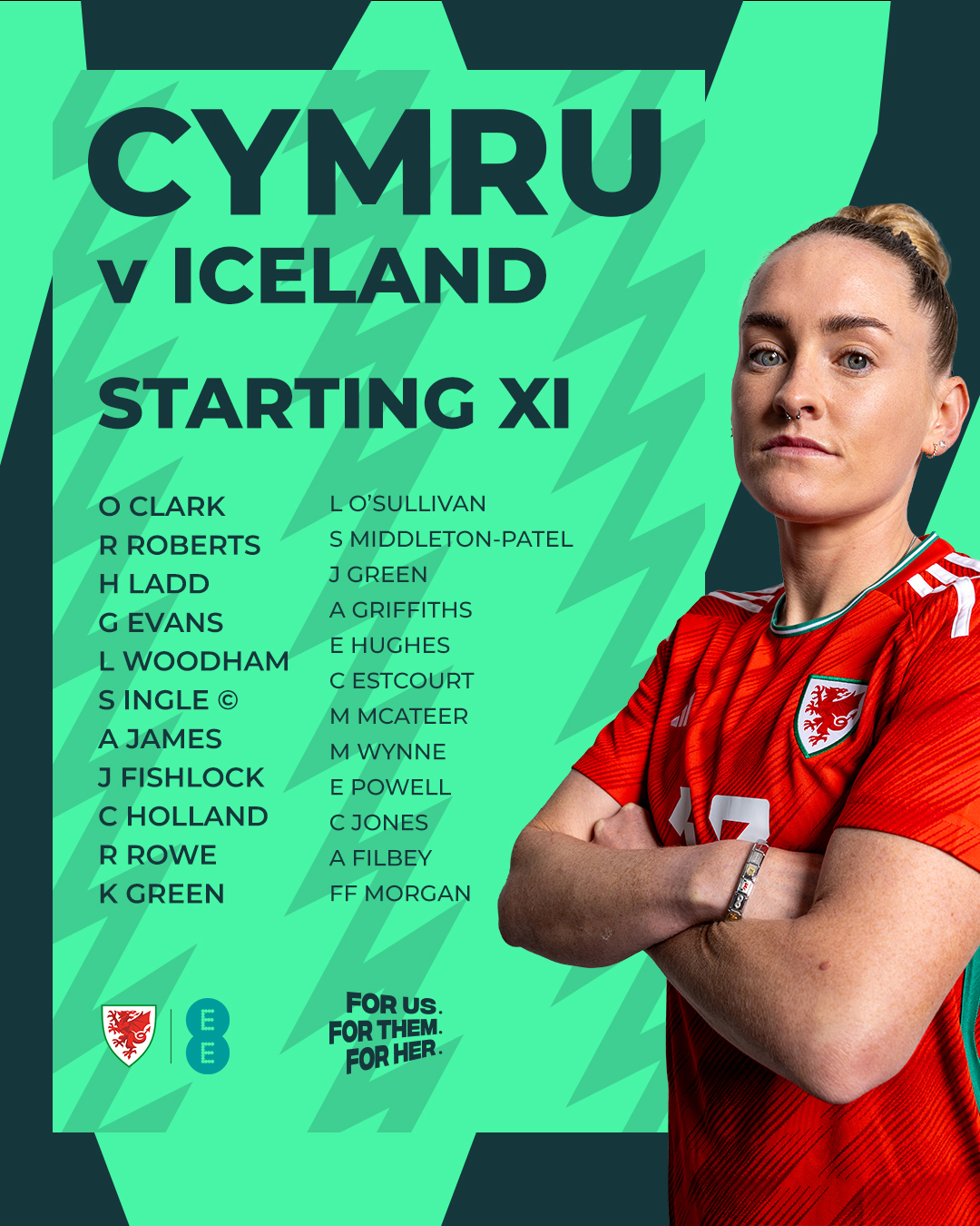 Gemma Grainger makes three changes to the squad that faced Denmark in Cymru’s last outing. Ceri Holland, Rachel Rowe and Kayleigh Green return the Starting XI for tonight’s clash against Iceland at the Cardiff City Stadium.