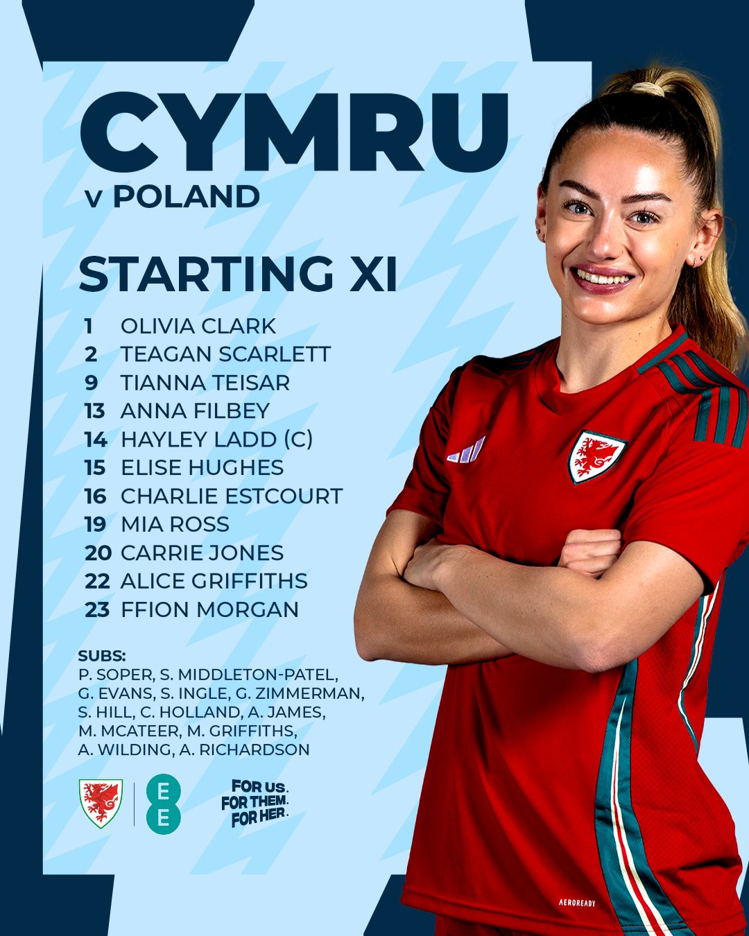 Sophie Ingle, Angharad James and Ceri Holland are amongst the senior players named on the substitutes bench, together with the uncapped trio of Amy Richardson, Annie Wilding and goalkeeper Poppy Soper.