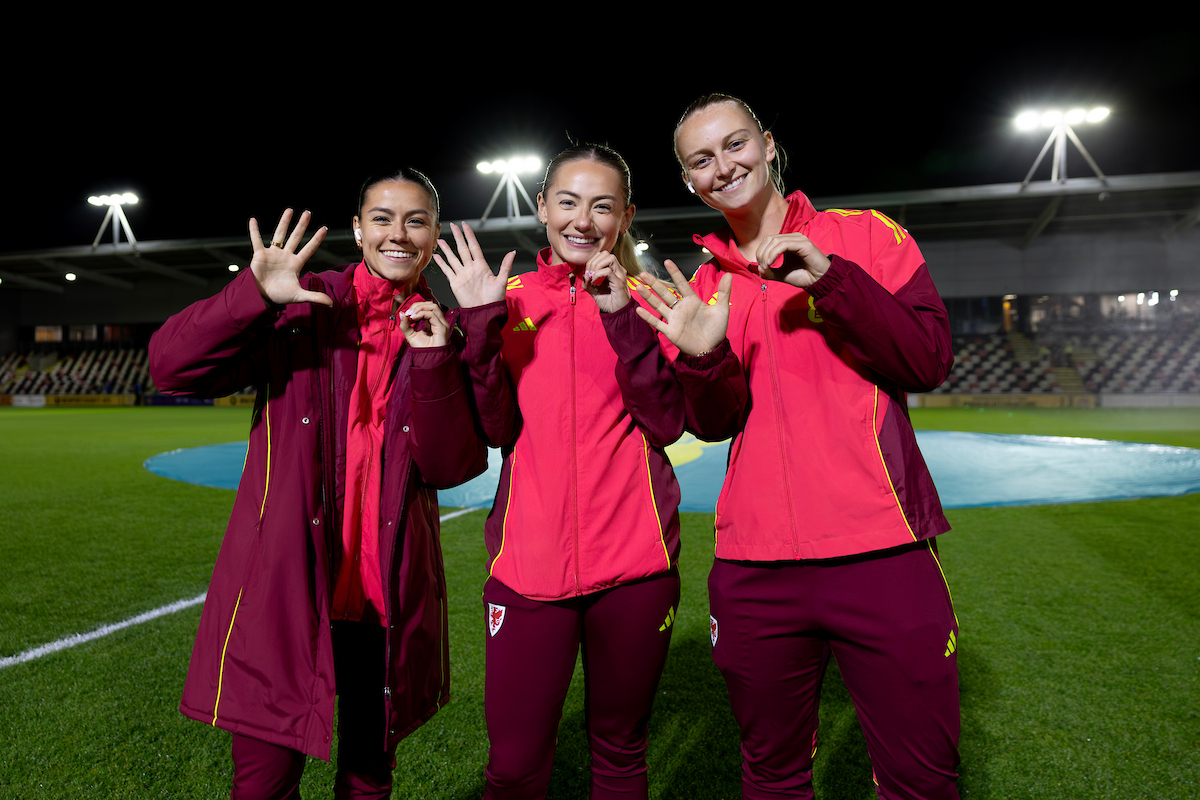 Charlie Estcourt is flanked by Ffion Morgan and Elise Hughes as she prepares to make her 50th Cymru appearance this evening.