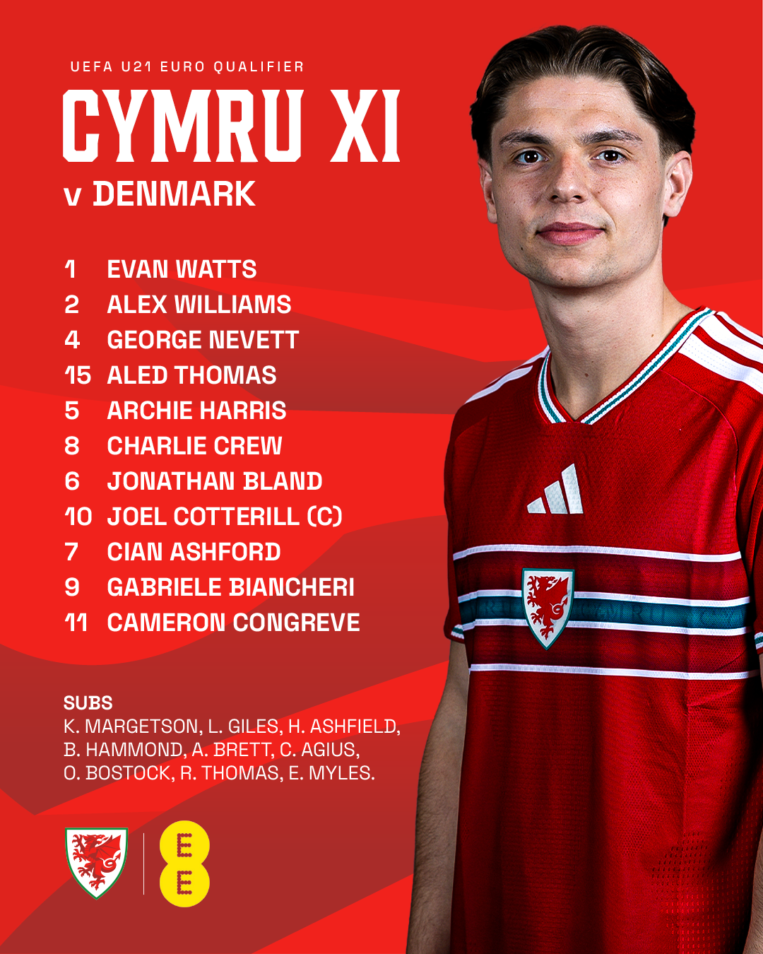 Here is how Cymru line up to face Denmark in Vejle this evening. Matty Jones makes two changes from Friday’s win over Belarus with goalkeeper Evan Watts and Jonathan Bland returning to the starting XI.