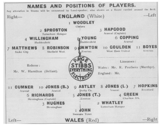 Cymru started brightly and took an early lead when Dai Astley took advantage of a clever pass from Leslie Jones. England equalised controversially after 30 minutes when Tommy Lawton converted a penalty awarded for handball, but while Cymru responded through Idris Hopkins as he headed in from free-kick, the great Stanley Matthews levelled to make it 2-2 at half-time.