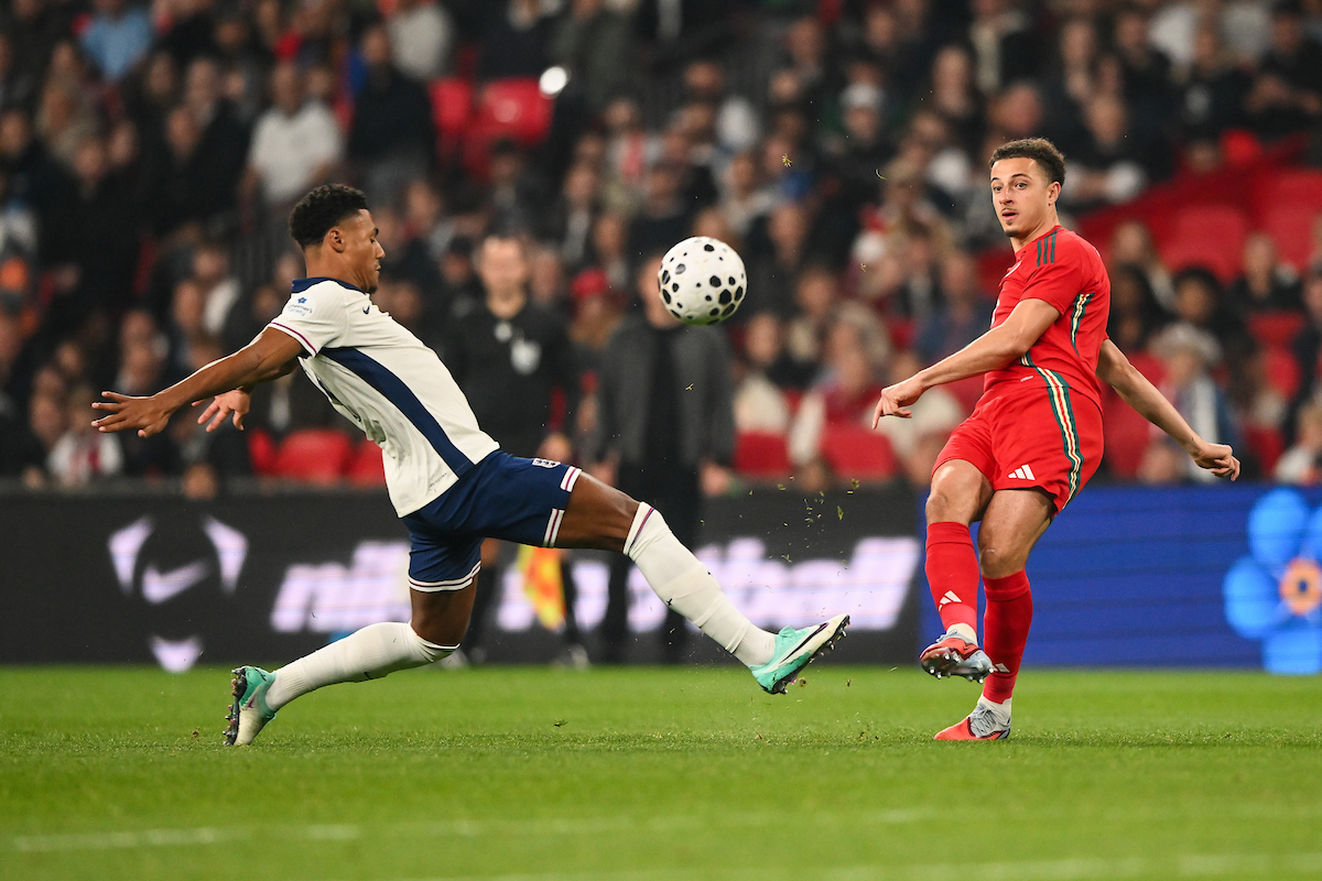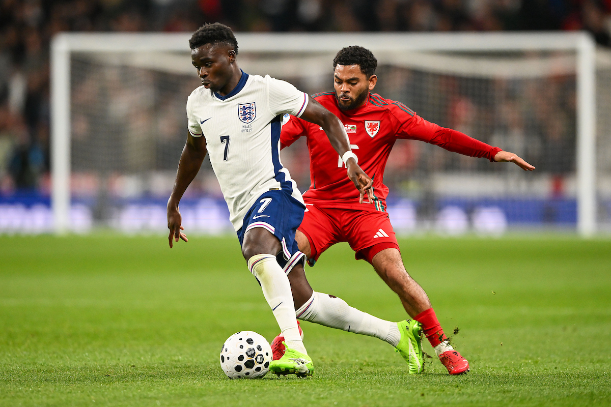 Cymru defender Jay Dasilva challenges England’s Bukayo Saka.
