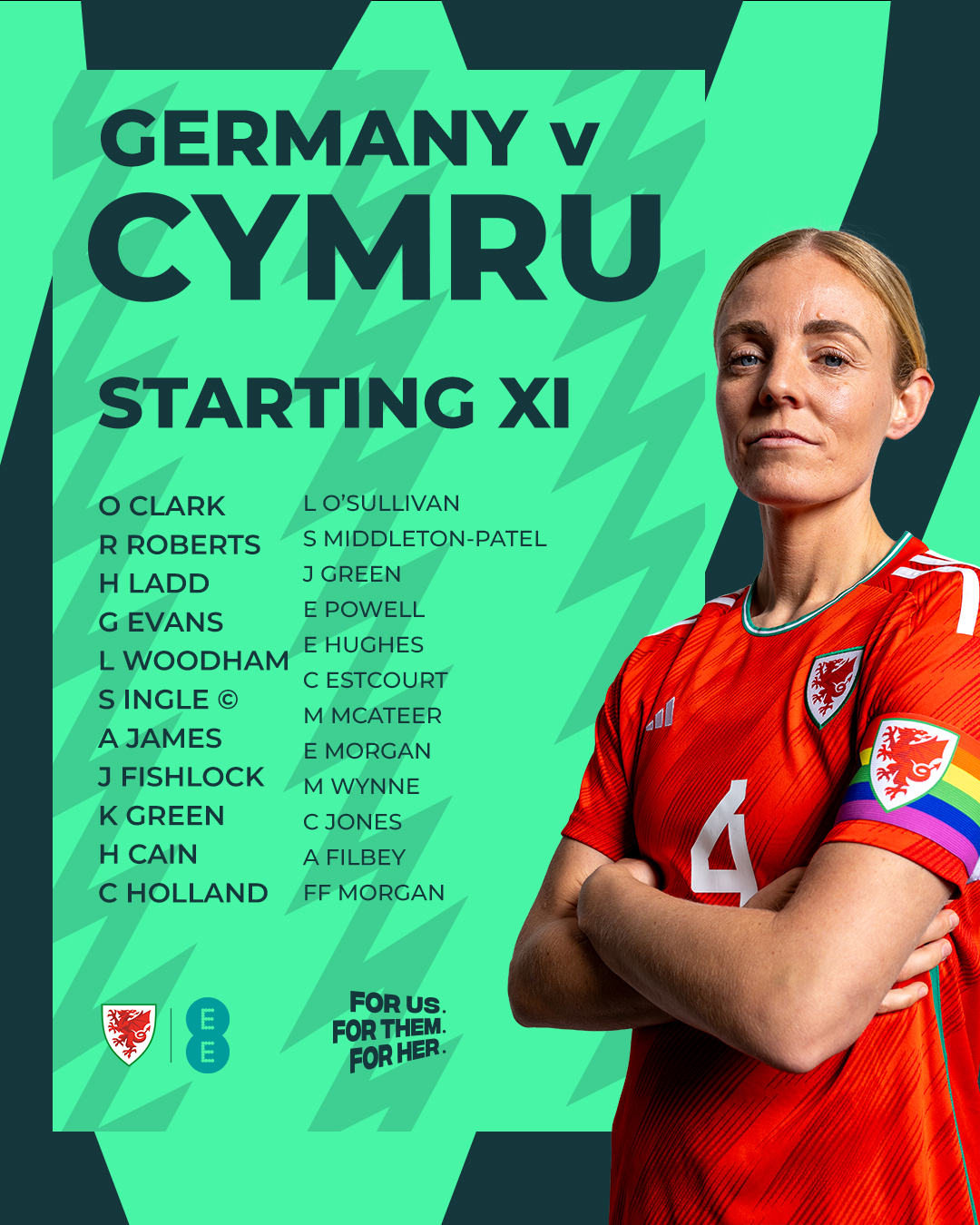 Gemma Grainger makes two changes to her starting line up from Cymru’s last outing against Denmark, with Kayleigh Green and Hannah Cain returning to the XI in place of Carrie Jones and the injured Rachel Rowe.