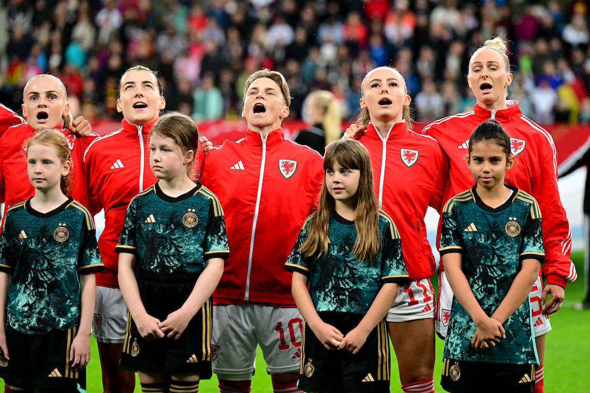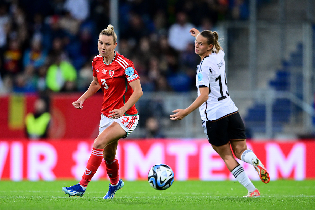 Half-time verdict: Germany dominated possession (72% to 28%) throughout the first half and deservedly took the lead midway through when Schüller headed home. The hosts could have added to their lead as the Cymru defence endured a busy half with the Germans enjoying 15 shots. Cymru, meanwhile, managed just one shot but that was enough to find the equaliser. Three of Grainger’s most experienced players – Fishlock, Ingle and James – all combined before the latter’s brilliant flick on found Holland, who finished off a well worked move.