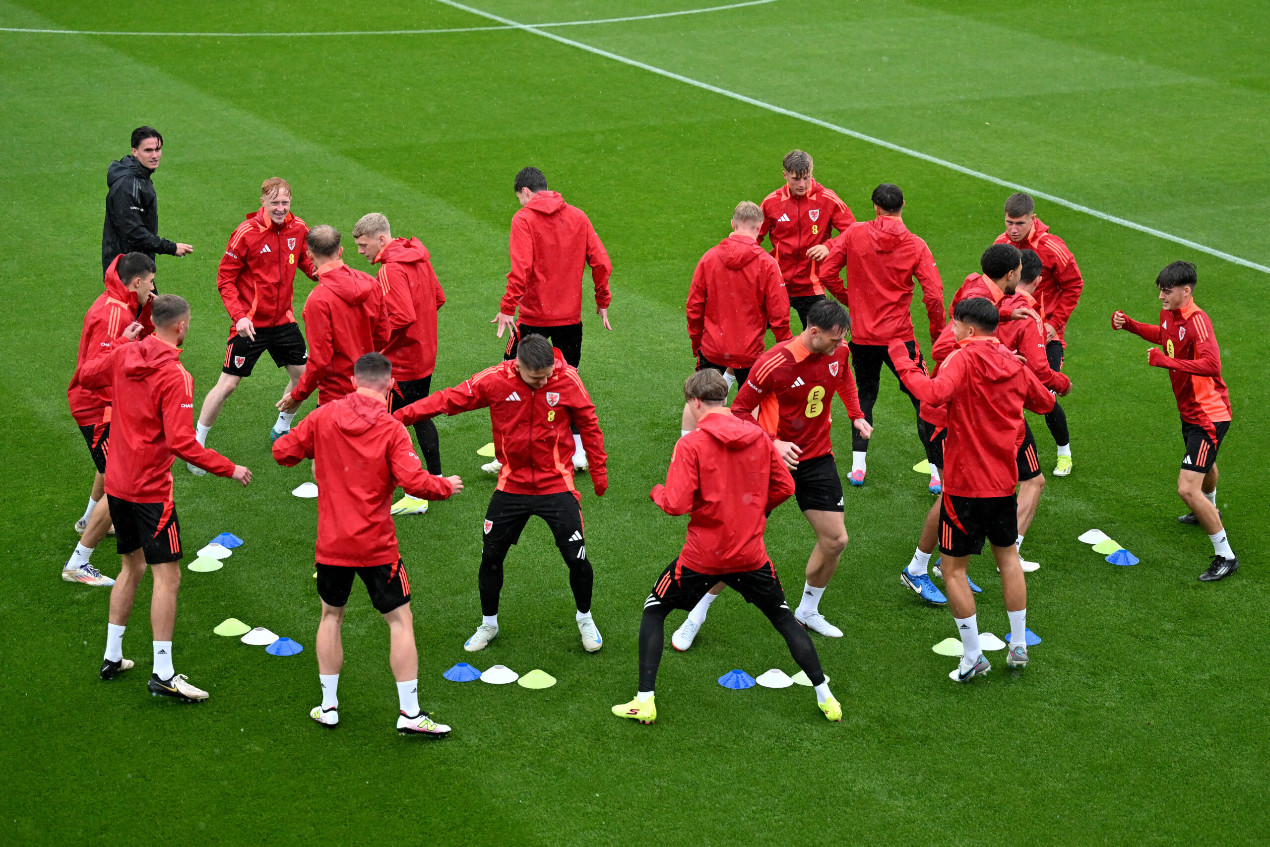 The Cymru squad complete their warm-up ahead of kick-off