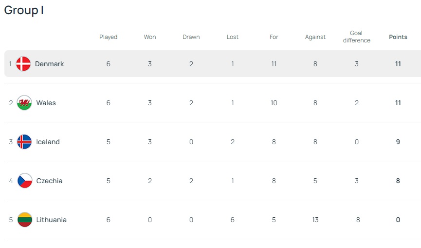 Iceland have a game in hand over Cymru and Denmark and still have to host Lithuania who remain pointless after six games. Cymru will complete their campaign at home to Czechia next month while Denmark and Iceland go head-to-head on the final round of fixtures.