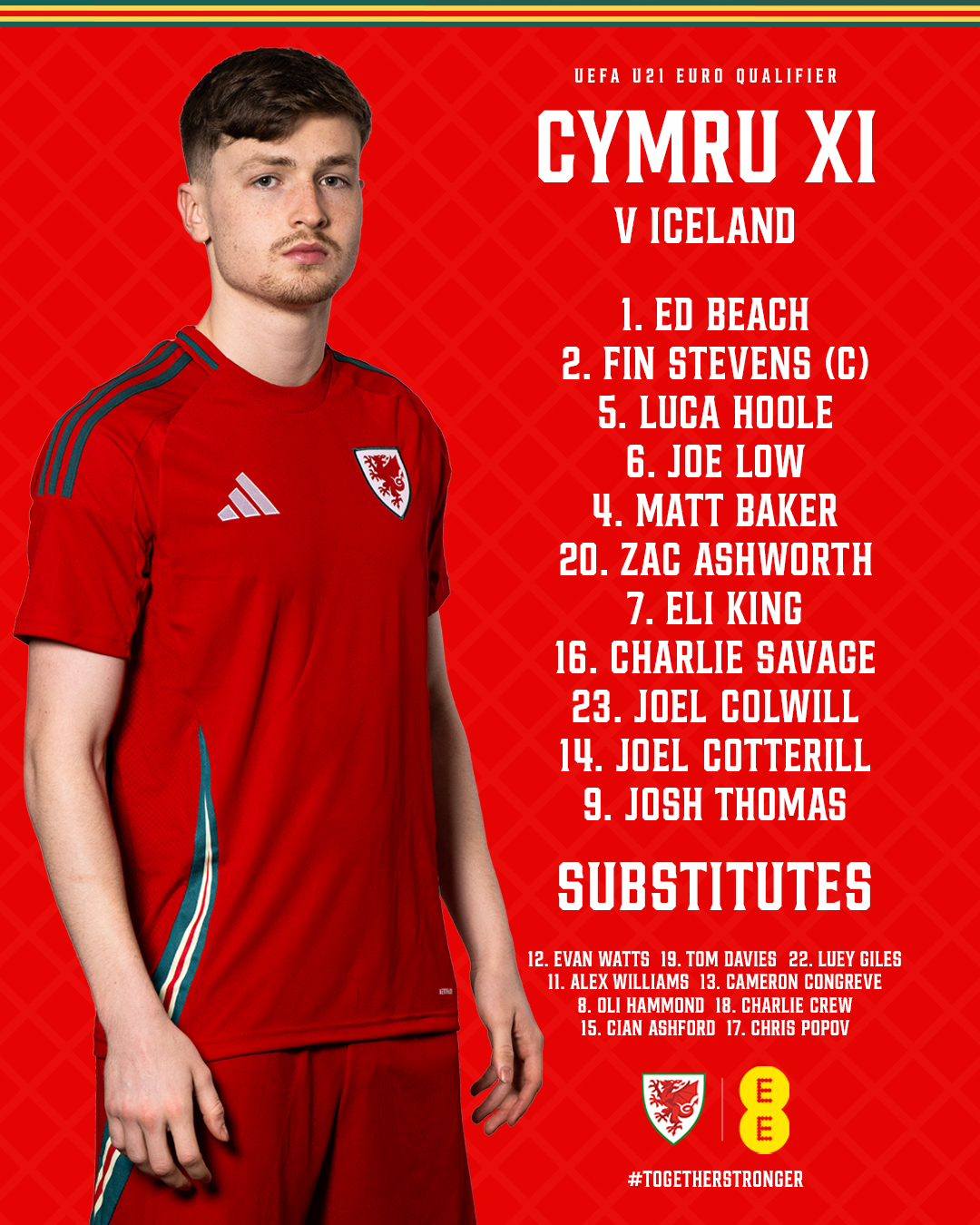 Charlie Crew, who was named on the bench for Cymru’s senior game against Türkiye on Friday, will now travel with the under 21 squad to Iceland.
