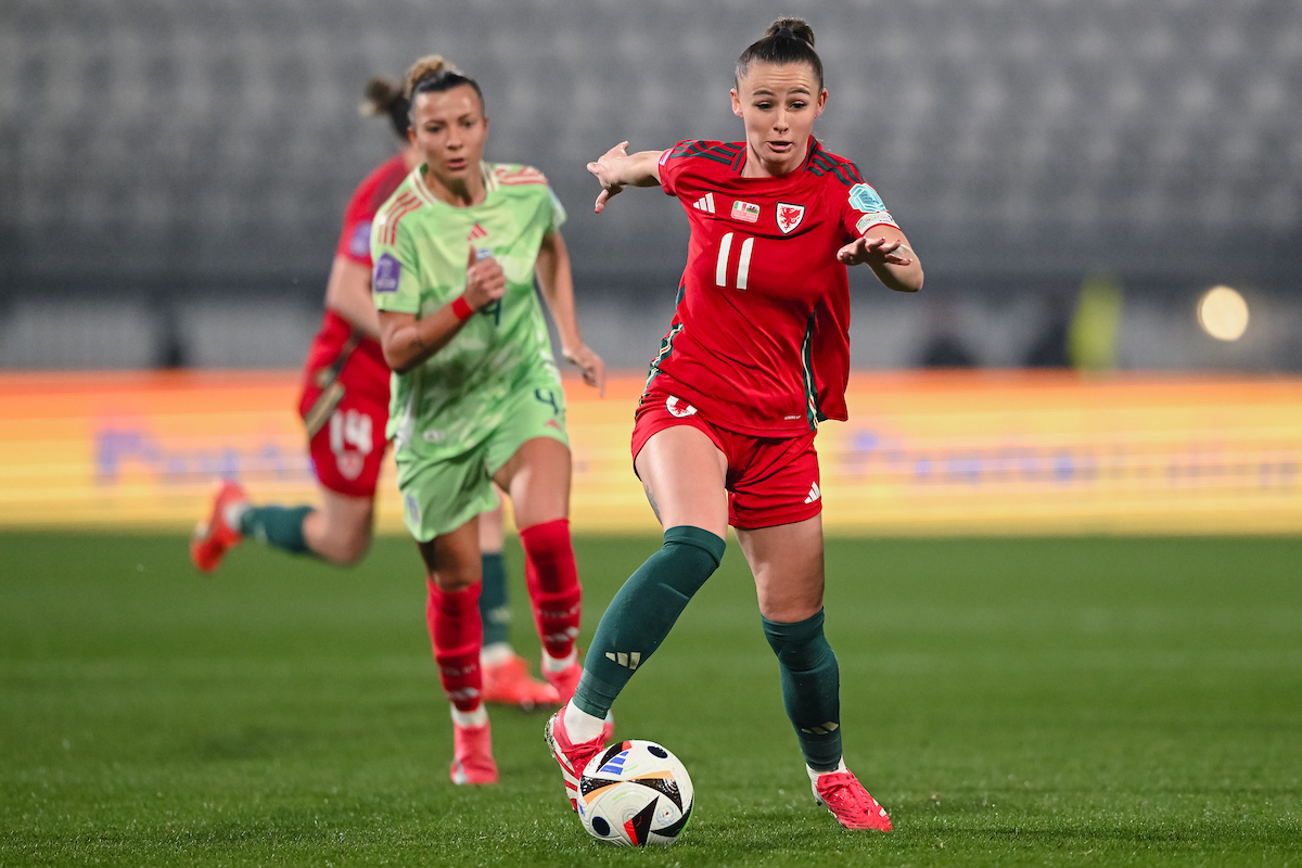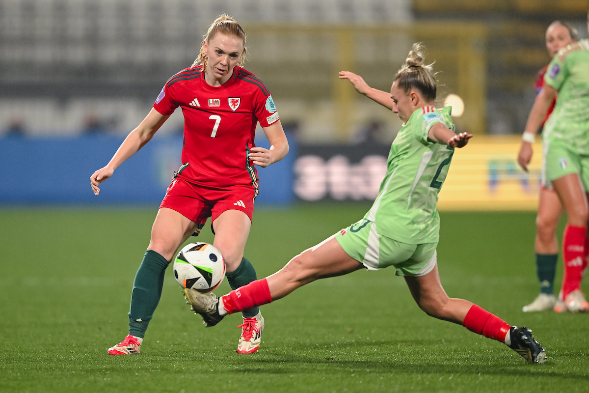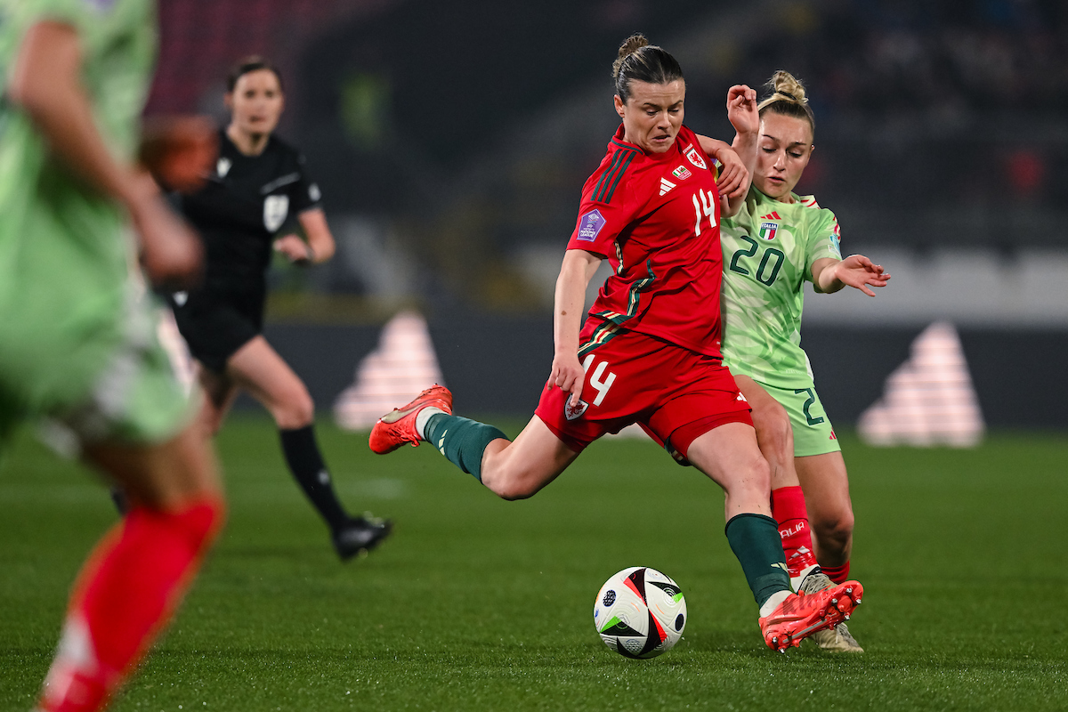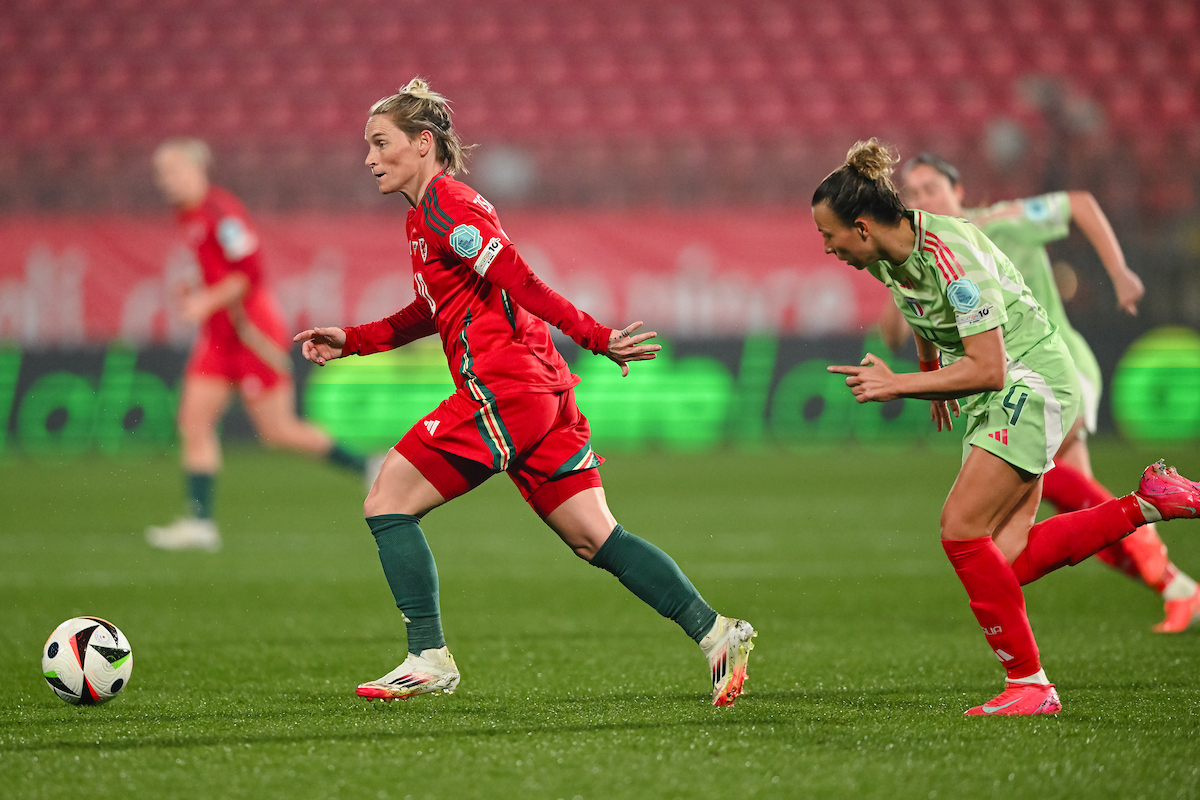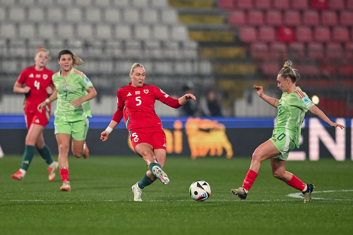 Italy enjoyed the perfect start as Barbara Bonansea jumped above Hannah Cain after five minutes to head the ball past goalkeeper Olivia Clark. It was Italy’s third corner as they made an aggressive start to the match, but after Clark made a double-save minutes after conceding the opening goal, Cymru defended well and quickly settled into the pace of the game, with Hayley Ladd captaining the side on her 100th appearance.