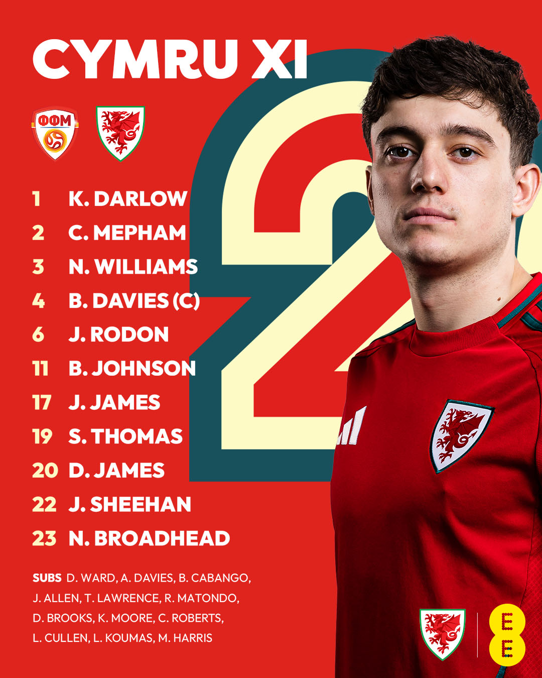 Chris Mepham, Jordan James and Nathan Broadhead all come into the starting line-up as Connor Roberts, David Brooks and Liam Cullen are named on the bench. Ben Davies captains the side on what will be his 94th international appearance.