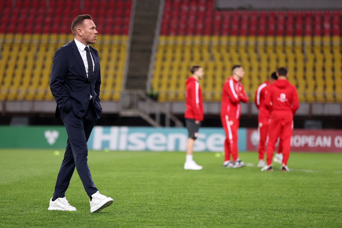 Cymru head coach Craig Bellamy takes a pre-match walk around the stadium in Skopje. Bellamy remains undefeated after seven matches in charge of the national team.