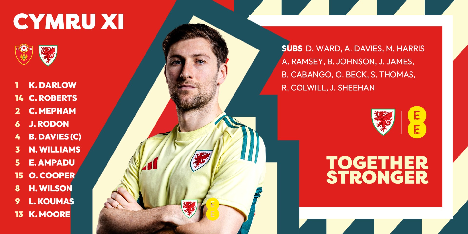Ben Davies captains the side while goalkeeper Karl Darlow makes his Cymru debut. Kieffer Moore returns to the starting line-up while Oli Cooper and 18-year old Lewis Koumas both make their first senior international starts.