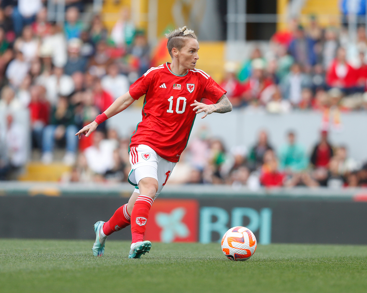 Cymru captain Sophie Ingle dictates the play in the centre of midfield with Angharad James in support. Both players have made over 100 appearances each for their country.