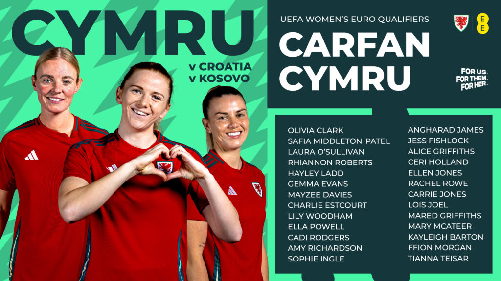 Cymru: Olivia CLARK (Bristol City), Laura O’SULLIVAN (Gwalia United), Safia MIDDLETON-PATEL (Manchester United), Rhiannon ROBERTS (Real Betis), Charlie ESTCOURT (Reading), Hayley LADD (Manchester United), Gemma EVANS (Manchester United), Mayzee DAVIES (Manchester United), Amy RICHARDSON (Celtic), Cadi RODGERS (FAW Girls Academy North), Tianna TEISAR (Bristol City), Lily WOODHAM (Seattle Reign), Ella POWELL (Bristol City), Sophie INGLE (Chelsea), Alice GRIFFITHS (Southampton), Angharad JAMES (Seattle Reign), Lois JOEL (Unattached), Rachel ROWE (Southampton), Carrie JONES (Bristol City), Ffion MORGAN (Bristol City), Jess FISHLOCK (Seattle Reign), Ceri HOLLAND (Liverpool), Ellen JONES (Sunderland), Kayleigh BARTON (Charlton Athletic), Mary MCATEER (Sunderland), Mared GRIFFITHS (FAW Girls Academy North).