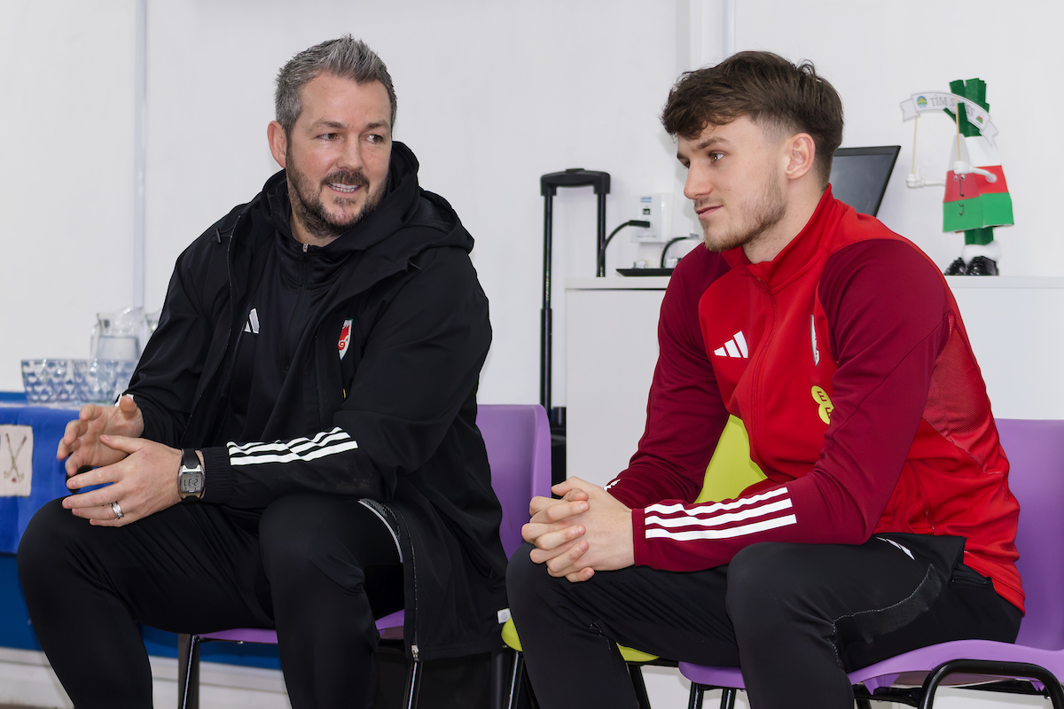 Cymru U21 duo visit Swiss Valley Primary School ahead of camp
