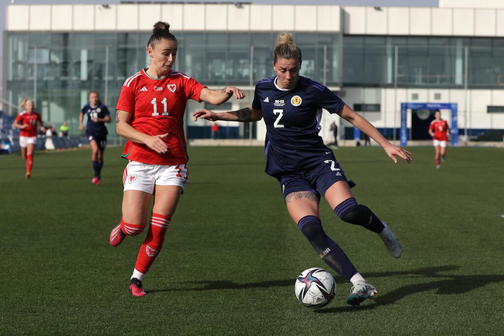 Scotland had enjoyed the majority of possession throughout the first half but Cymru drew level against the run of play just before half time. Goalkeeper Clark’s ball down field started the move before Cain and Fishlock combined, with the latter finding Holland’s run with an inch-perfect through ball. The Liverpool forward took a touch and then curled beyond Lee Gibson with a composed finish.