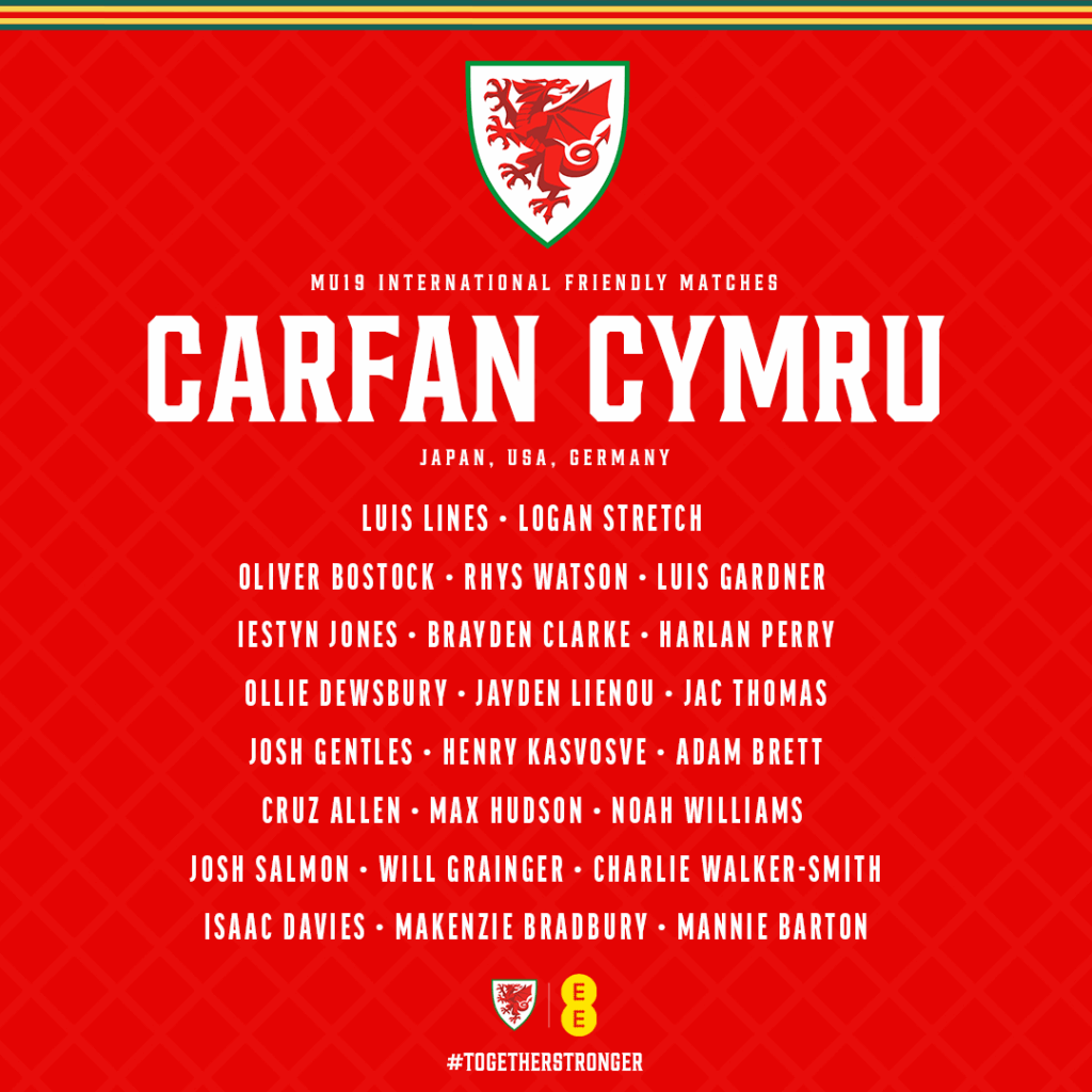 Luis LINES (Norwich City), Logan STRETCH (Sheffield Wednesday), Oliver BOSTOCK (West Bromwich Albion), Rhys WATSON (Stockport County), Luis GARDNER (Everton), Iestyn JONES (Swansea City), Brayden CLARKE (Arsenal), Harlan PERRY (Swansea City), Ollie DEWSBURY (Bristol Rovers), Jayden LIENOU (Leeds United), Jac THOMAS (Cardiff City), Charlie WALKER-SMITH (Crystal Palace), Isaac DAVIES (Nottingham Forest), Makenzie BRADBURY (Wolverhampton Wanderers), Mannie BARTON (Cardiff City), Josh GENTLES (Rangers), Henry KASVOSVE (Brighton & Hove Albion), Adam BRETT (Brighton & Hove Albion), Cruz ALLEN (Derby County), Max HUDSON (Manchester City), Noah WILLIAMS (Cardiff City), Josh Salmon (Weston-super-Mare), Will GRAINGER (Sheffield Wednesday).