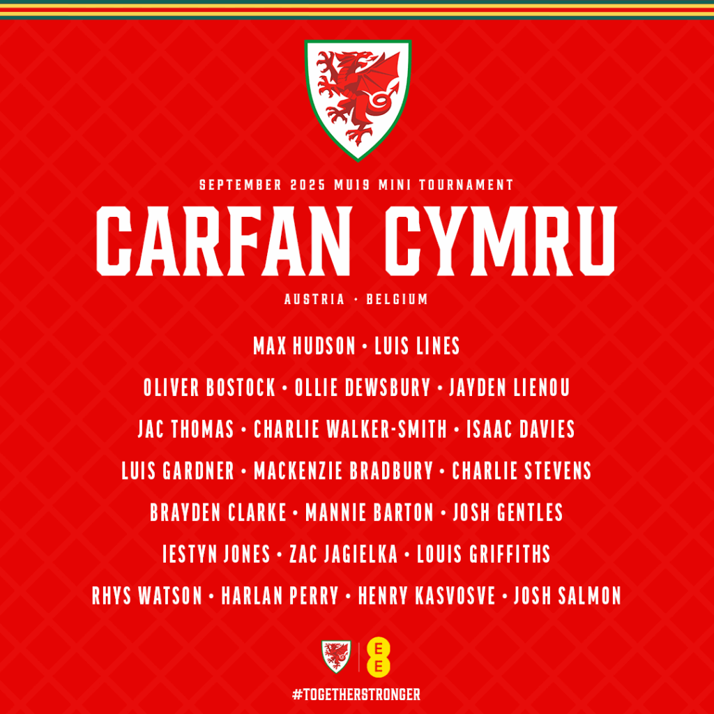 Max HUDSON (Manchester City), Luis LINES (Norwich City), Henry KASVOSVE (Brighton & Hove Albion), Oliver BOSTOCK (West Bromwich Albion), Ollie DEWSBURY (Bristol Rovers), Jayden LIENOU (Leeds United), Jac THOMAS (Cardiff City), Charlie WALKER-SMITH (Crystal Palace), Isaac DAVIES (Nottingham Forest), Luis GARDNER (Everton), Makenzie BRADBURY (Wolverhampton Wanderers), Charlie STEVENS (AFC Bournemouth), Brayden CLARKE (Arsenal), Mannie BARTON (Cardiff City), Josh GENTLES (Rangers), Iestyn JONES (Swansea City), Zac JAGIELKA (Hull City), Louis GRIFFITHS (Oxford United), Rhys WATSON (Stockport County), Harlan PERRY (Swansea City), Josh SALMON (Weston Super Mare).