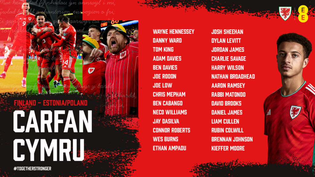 Cymru: Wayne HENNESSEY (Nottingham Forest), Danny WARD (Leicester City), Tom KING (Wolverhampton Wanderers), Adam DAVIES (Sheffield United), Ben DAVIES (Tottenham Hotspur), Joe RODON (Leeds United, on loan from Tottenham Hotspur), Joe LOW (Wycombe Wanderers), Chris MEPHAM (Bournemouth), Ben CABANGO (Swansea City), Neco WILLIAMS (Nottingham Forest), Jay DASILVA (Coventry City), Connor ROBERTS (Leeds United- On loan from Burnley), Wes BURNS (Ipswich Town), Ethan AMPADU (Leeds United), Josh SHEEHAN (Bolton Wanderers), Dylan LEVITT (Hibernian), Jordan JAMES (Birmingham City), Charlie SAVAGE (Reading), Harry WILSON (Fulham), Nathan BROADHEAD (Ipswich Town), Aaron RAMSEY (Cardiff City), Rabbi MATONDO (Rangers), David BROOKS (Southampton- On loan from Bournemouth), Daniel JAMES (Leeds United), Liam CULLEN (Swansea City), Rubin COLWILL (Cardiff City), Brennan JOHNSON (Tottenham Hotspur), Kieffer MOORE (Ipswich Town, on loan from Bournemouth).