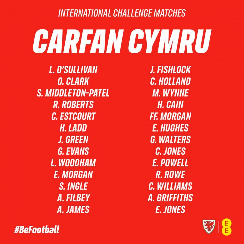 Cymru: Laura O’SULLIVAN (Cardiff City Ladies), Olivia CLARK (Bristol City), Safia MIDDLETON-PATEL (Manchester United), Rhiannon ROBERTS (Liverpool), Charlie ESTCOURT (Birmingham City), Hayley LADD (Manchester United), Josie GREEN (Leicester City), Gemma EVANS (Reading), Lily WOODHAM (Reading), Esther MORGAN (Sunderland – on loan from Tottenham Hotspur), Sophie INGLE (Chelsea), Anna FILBEY (Crystal Palace), Angharad JAMES (Tottenham Hotspur), Jess FISHLOCK (OL Reign), Ceri HOLLAND (Liverpool), Megan WYNNE (Southampton), Hannah CAIN (Leicester City), Ffion MORGAN (Bristol City), Elise HUGHES (Crystal Palace), Georgia WALTERS (Sheffield United), Carrie JONES (Leicester City), Ella POWELL (Bristol City), Rachel ROWE (Reading), Chloe WILLIAMS (Blackburn Rovers – on loan from Manchester United), Alice GRIFFITHS (Southampton), Ellen JONES (Coventry United – on loan from Leicester City).