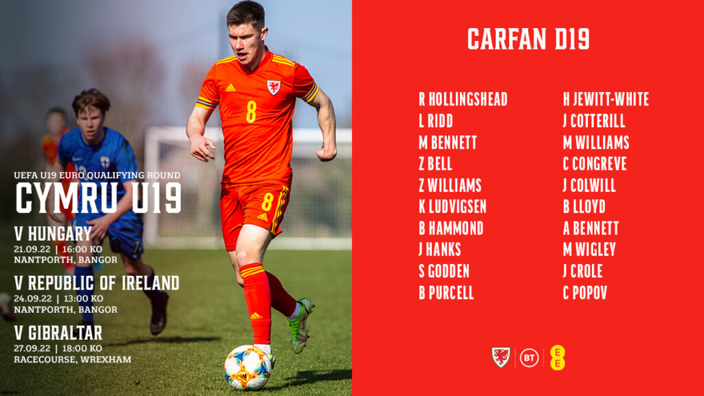 Cymru U19: Ronnie HOLLINGSHEAD (West Bromwich Albion), Lewis RIDD (Ipswich Town), Murphy BENNETT (Forest Green Rovers), Zac BELL (Bristol City), Zac WILLIAMS (Crewe Alexandra), Kai LUDVIGSEN (Swansea City), Ben HAMMOND (Nottingham Forest), Justin HANKS (Nottingham Forest), Scott GODDEN (Leeds United), Benjamin PURCELL (Reading), Harry JEWITT-WHITE (Portsmouth), Joel COTTERILL (Swansea City), Morgan WILLIAMS (AFC Wimbledon), Cameron CONGREVE (Swansea City), Joel COLWILL (Cardiff City), Ben LLOYD (Swansea City), Aaron BENNETT (Altrincham on loan from Preston North End), Morgan WIGLEY (Cardiff City), James CROLE (Cardiff City), Chris POPOV (Leicester City)