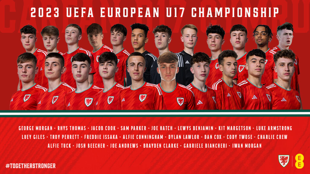 Cymru MU17: Alfie CUNNINGHAM (Exeter City), Alfie TUCK (Queens Park Rangers), Brayden CLARKE (Wolves), Charlie CREW (Leeds United), Cody TWOSE (Cardiff City), Dan COX (Derby County), Dylan LAWLOR (Cardiff City), Freddie ISSAKA (Plymouth Argyle), Gabriele BIANCHERI (Manchester United), George MORGAN (Everton), Iwan MORGAN (Swansea City), Jacob COOK (Swansea City), Joe ANDREWS (Southampton), Joe HATCH (Plymouth Argyle), Josh BEECHER (Cardiff City), Kit MARGETSON (Swansea City), Lewys BENJAMIN (Cardiff City), Luey GILES (Cardiff City), Luke ARMSTRONG (Cardiff City), Rhys THOMAS (Manchester City), Sam PARKER (Swansea City), Troy PERRETT (Cardiff City).