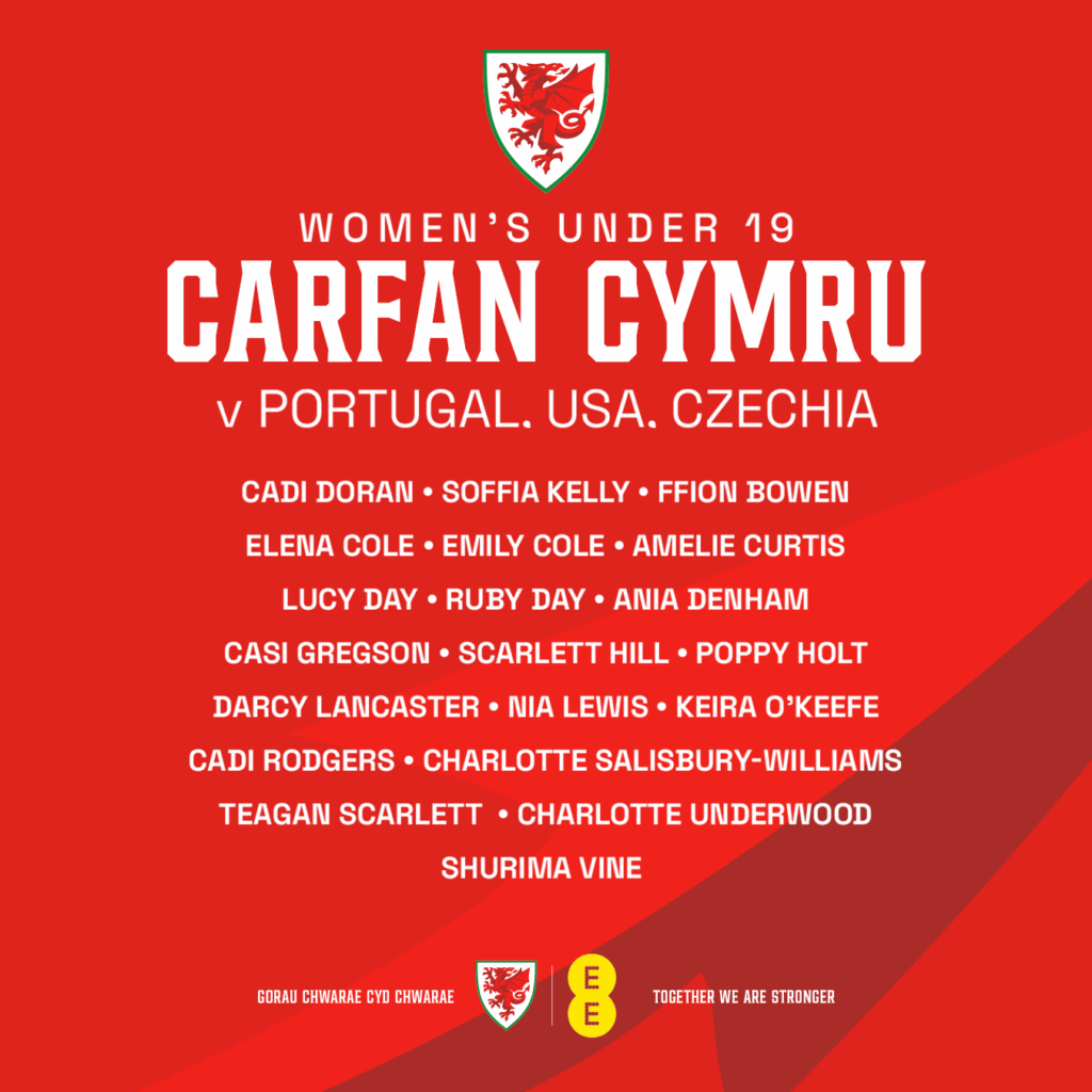 Cymru WU19: Cadi DORAN (University of Washington), Soffia KELLY (Rangers – On loan from Aston Villa), Ffion BOWEN (Leicester City), Elena COLE (Bournemouth), Emily COLE (Liverpool Feds), Amelie CURTIS (Cheltenham Town), Lucy DAY (Birmingham City – dual signing at West Bromwich Albion), Ruby DAY (Bristol City), Ania DENHAM (Sporting Khalsa – on loan from Wolverhampton Wanderers), Casi GREGSON (Newcastle United), Scarlett HILL (Sheffield United – On loan from Manchester United), Poppy holt (Manchester United), Darcey LANCASTER (Stoke City), Nia LEWIS (Bristol City), Keira O’KEEFE (Gwalia United), Cadi RODGERS (Chelsea), Charlotte SALISBURY-WILLAIMS (Cheltenham Town), Teagan SCARLETT (Real Bedford – On loan from Arsenal), Charlotte UNDERWOOD (Chelsea), Shurima VINE (Gwalia United).