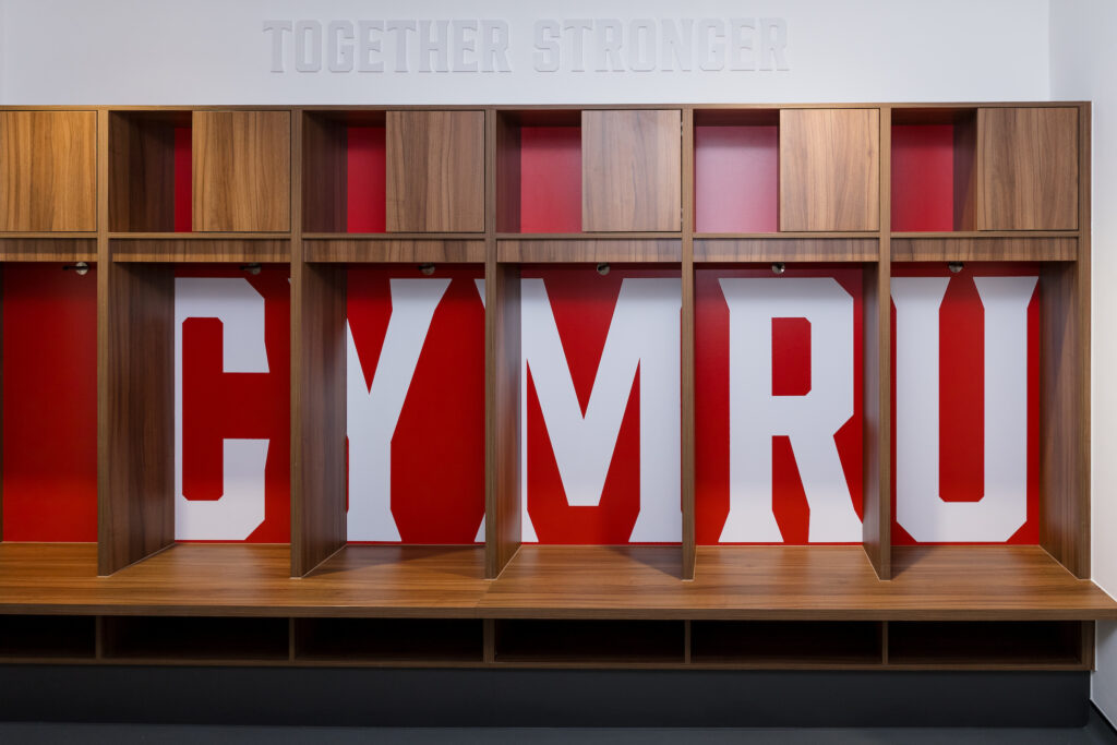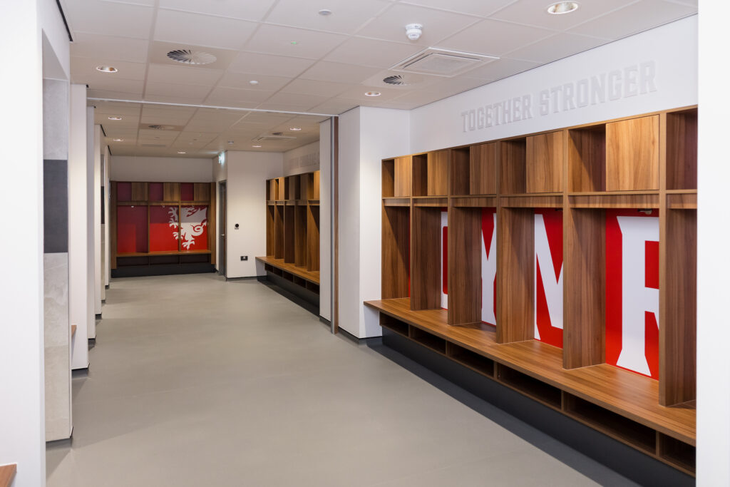 On the pitch, the work has extended the gym and activation used by the Cymru National Teams and brings increased space for analysis and sports science requirements, next to a medical area that was already in place. A new ‘boots on’ area has been built for the Cymru players, and coaches changing rooms are also part of the new wing.