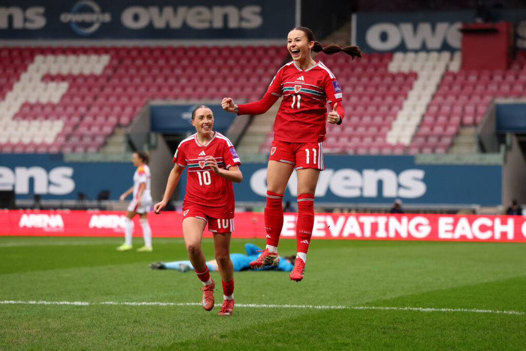 The Cymru forward netted her third goal in two games, alongside strikes from Mared Griffiths, Rachel Rowe and Sophie Ingle, as Rhian Wilkinson’s side scored five first-half goals without reply.