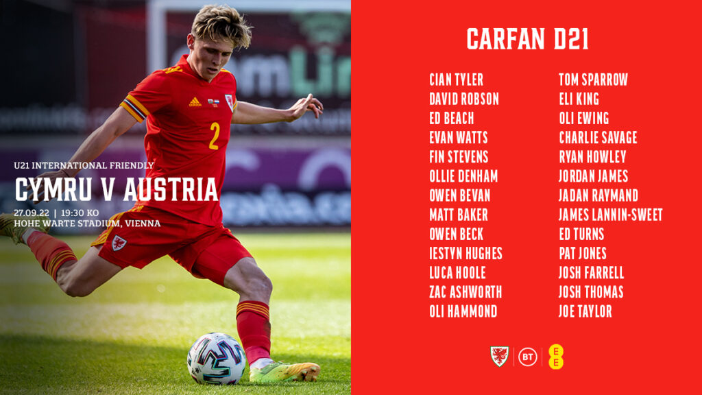 Cymru U21: Cian TYLER (Coventry City), David ROBSON (Hull City), Ed BEACH (Chelsea), Evan WATTS (Swansea City), Fin STEVENS (Swansea City – on loan from Brentford), Ollie DENHAM (Cardiff City), Owen BEVAN (Yeovil Town – on loan from Bournemouth), Matt BAKER (Stoke City), Owen BECK (Bolton Wanderers – on loan from Liverpool), Iestyn HUGHES (Leicester City), Luca HOOLE (Bristol Rovers), Zac ASHWORTH (West Bromwich Albion), Oli HAMMOND (Nottingham Forest), Tom SPARROW (Stoke City), Eli KING (Crewe Alexandra – on loan from Cardiff City), Oli EWING (Leicester City), Charlie SAVAGE (Manchester United), Ryan HOWLEY (Coventry City), Jordan JAMES (Birmingham City), Jadan RAYMOND (Crystal Palace), James LANNIN-SWEET (Arsenal), Ed TURNS (Brighton & Hove Albion), Pat JONES (Huddersfield Town), Josh FARRELL (Juventud de Torremolinos CF – on loan from Granada FC), Josh THOMAS (Swansea City), Joe TAYLOR (Peterborough).