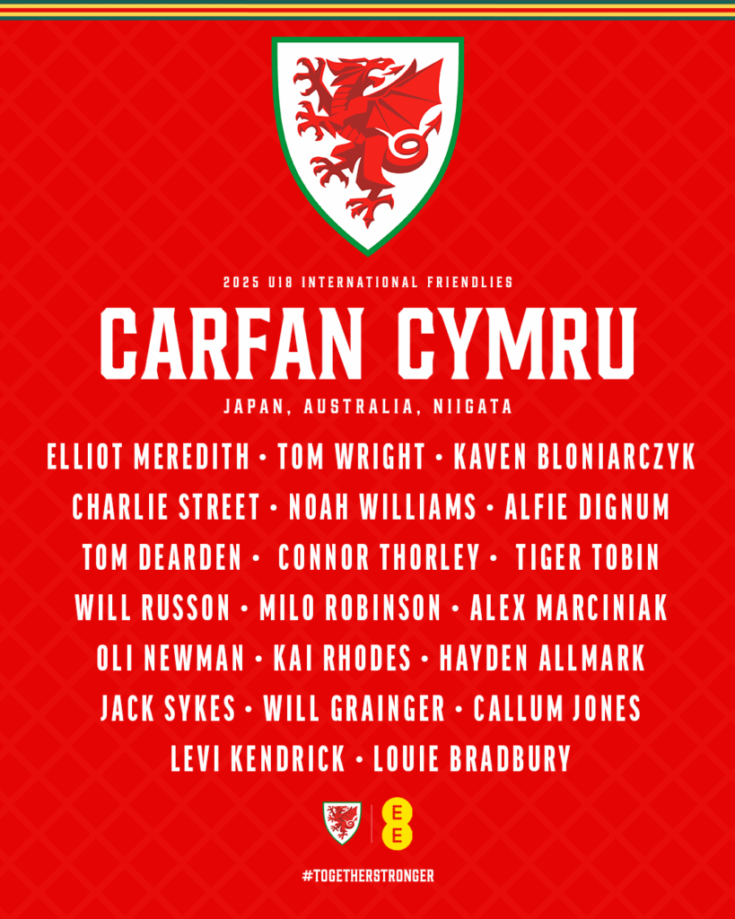 Cymru MU18 squad: Elliot MEREDITH (Coventry City), Tom WRIGHT (Swansea City), Kaven BLONIARCZYK (Swansea City), Charlie STREET (Queens Park Rangers), Noah WILLIAMS (Cardiff City), Alfie DIGNUM (Leicester City), Tom DEARDEN (Sheffield United), Connor THORLEY (Wrexham), Tiger TOBIN (Cardiff City), Will RUSSON (Coventry City), Milo ROBINSON (Swansea City), Alex MARCINIAK (Arsenal), Oli NEWMAN (Southampton), Kai RHODES (Swansea City), Hayden ALLMARK (Cardiff City), Jack SYKES (Cardiff City), Will GRAINGER (Sheffield Wednesday), Callum JONES (Swansea City), Levi KENDRICK (Bolton Wanderers), Louie BRADBURY (Manchester United).