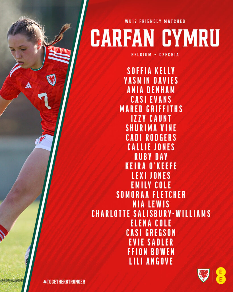 Cymru WU17: Soffia Kelly (FAW Girls Academy South), Yasmin Davies (Bristol City), Ania Denham (Wolves), Casi Evans (FAW Girls Academy North), Mared Griffiths (FAW Girls Academy North), Izzy Caunt (FAW Girls Academy South), Shurima Vine (FAW Girls Academy South), Cadi Rodgers (FAW Girls Academy North), Callie Jones (Bristol City), Ruby Day (Bristol City), Keira O’Keefe (FAW Girls Academy South), Lexi Jones (FAW Girls Academy North), Emily Cole (Everton), Somoraa Fletcher (FAW Girls Academy South), Nia Lewis (FAW Girls Academy South), Charlotte Salisbury Williams (FAW Girls Academy North), Elena Cole (FAW Girls Academy South), Casi Gregson (FAW Girls Academy South), Evie Sadler (FAW Girls Academy North), Ffion Bowen (FAW Girls Academy South), Lili Angove (FAW Girls Academy South).